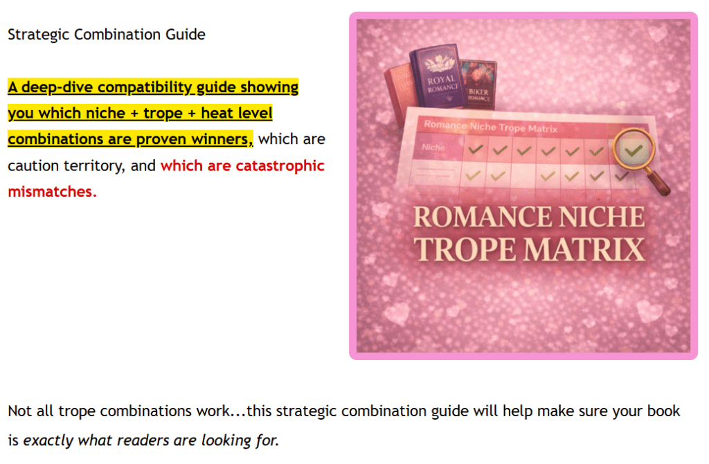 One of the most valuable features is the deep dive into market expectations. Not every story idea is a winner, and this guide categorizes niche, trope, and “heat level” (sensuality) combinations into three categories:
