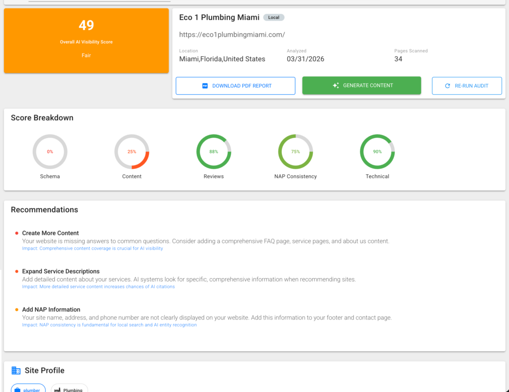 - Trust Signals: Fixes Google Business Profile errors and adds reputation elements that AI bots prioritize.